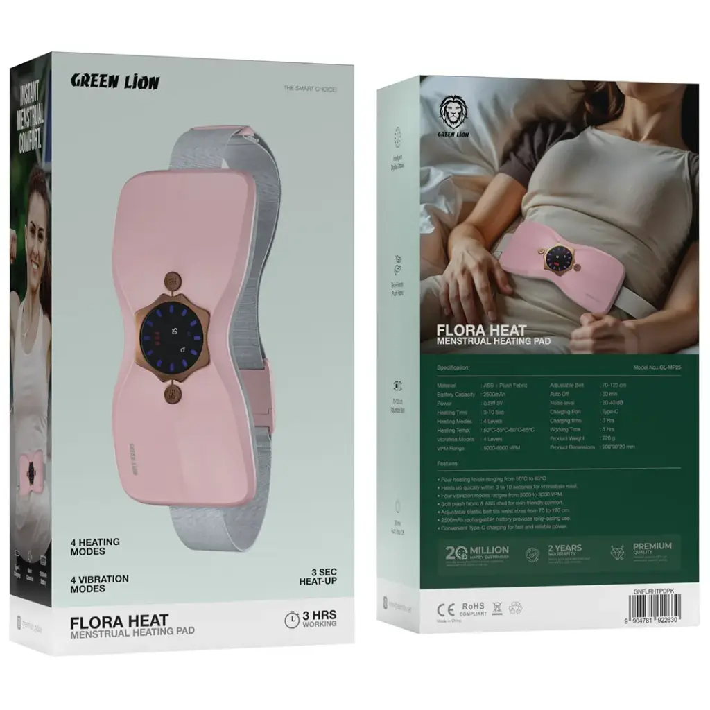مزودة بميزات عصرية، تُعد وسادة التدفئة الحيضية جرين لايون فلورا هيت منقذةً في أوقات آلام الدورة الشهرية وعدم الراحة المصاحبة لها. تتيح بطارية بسعة 2500 مللي أمبير في الساعة تشغيلًا متواصلًا لمدة 3 ساعات. تسخن الوسادة في غضون 3-10 ثوانٍ فقط، ويمكن تعديل درجة الحرارة بين 50 درجة مئوية و65 درجة مئوية، لتختاري المستوى الأمثل لراحتك. تصدر الوسادة اهتزازات بأربعة أوضاع مختلفة، مع نطاق تردد يتراوح بين 5000 و8000 اهتزازة في الدقيقة، لتوفير راحة مخصصة لكِ. يضمن الحزام القابل للتعديل (70-120 سم) تثبيت الوسادة بإحكام، كما أنها مزودة بشاشة رقمية ذكية لسهولة الاستخدام. مصنوعة من قماش فخم ناعم ولطيف على البشرة، لتوفير أقصى درجات الراحة. ولضمان السلامة، تتوقف الوسادة تلقائيًا عن العمل بعد 30 دقيقة، وتعمل بهدوء تام بمستوى ضوضاء يتراوح بين 20 و40 ديسيبل، ويتم شحنها عبر منفذ Type-C في غضون 3 ساعات. مثالية لتخفيف الألم والاسترخاء.